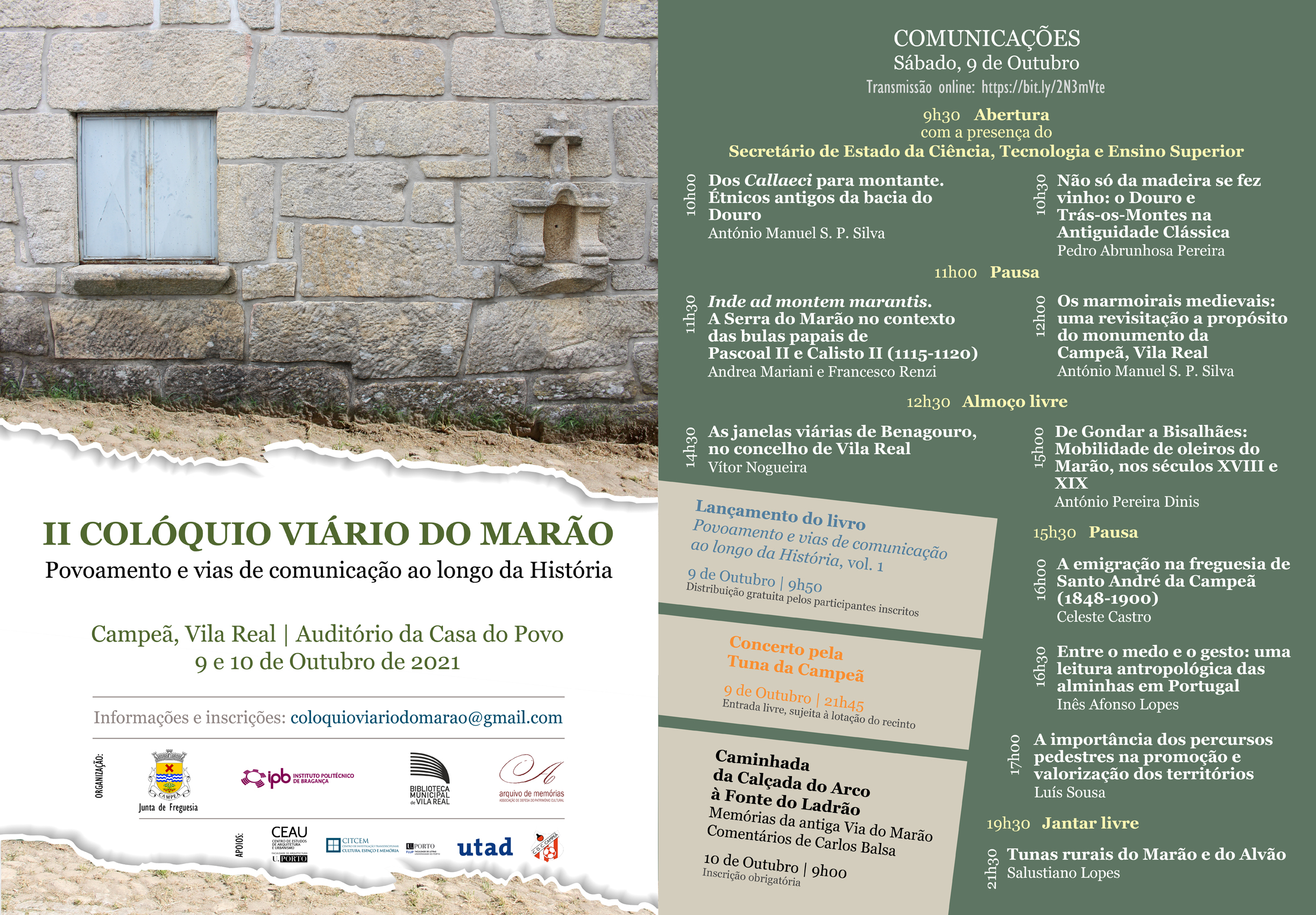 The II Colloquium on Marão ‘s Roads – Towns and communication routes throughout History will take place in the auditorium of Casa do Povo da Campeã (41°17’29.64 “N, 7°52’27.47 “W), Vila Real, next October 9th and 10th, with online broadcasting: https://bit.ly/2N3mVte