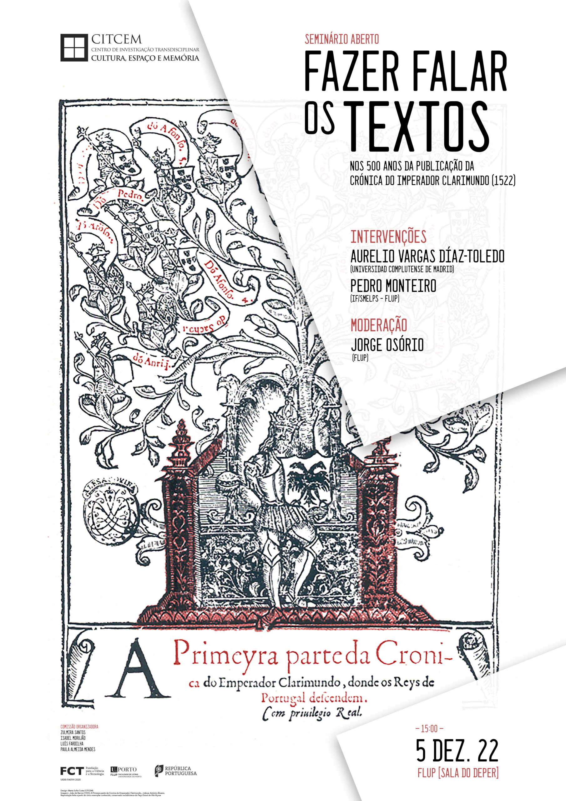 Aurélio Vargas Díaz-Toledo (U. Completense of Madrid) and Pedro Monteiro (FLUP), moderated by Jorge Osório (FLUP), will explore the “500 Years of the Publication of the Chronicle of Emperor Clarimund (1522)”, as part of the open seminar “Making Texts Speak”.